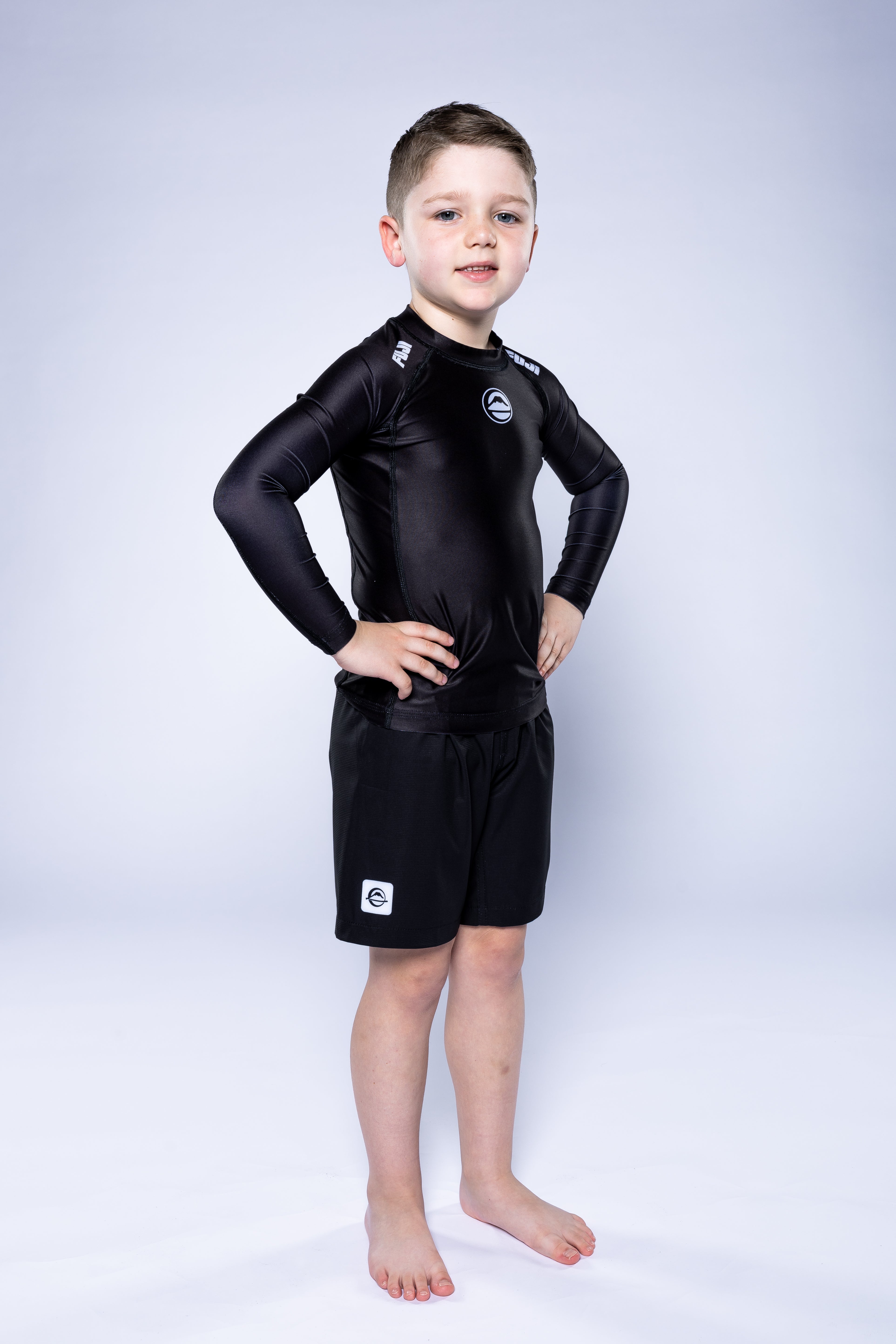 A young boy with short hair stands confidently with his hands on his hips, wearing the Kids Baseline 2.0 Long Sleeve Rashguard Black and matching black shorts against a plain light background.